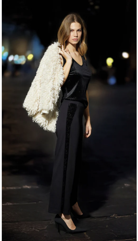 Sei pronta a catturare ogni sguardo e sentirti la regina indiscussa di ogni festa? Il nostro pantalone velo e lurex Jadea è più di un semplice capo d'abbigliamento: è una dichiarazione di stile. Realizzato per la donna che ama osare con eleganza, questo magnifico pantalone palazzo unisce la fluidità del velo alla brillantezza del lurex, creando un effetto scenografico unico. Perfetto per le tue serate più glamour, è il segreto per un look indimenticabile e ricercato, un vero must-have tra i pantaloni eleganti donna.